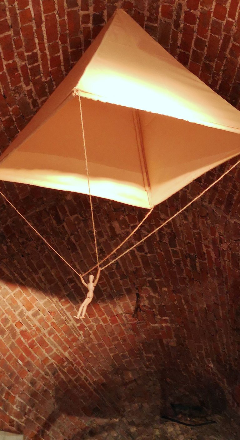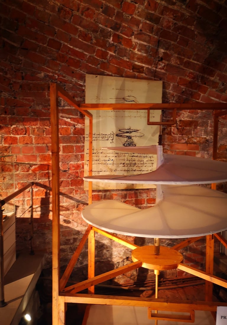 Skraidymo aparatas, kurį genialusis italas išrado 1485 metais, yra piramidės formos. Jo laikančiosios konstrukcijos - keturi lygiakraščiai trikampiai 7 metrų ilgio kraštinėmis, ant kurių pritvirtintas šiuolaikinis audeklas.